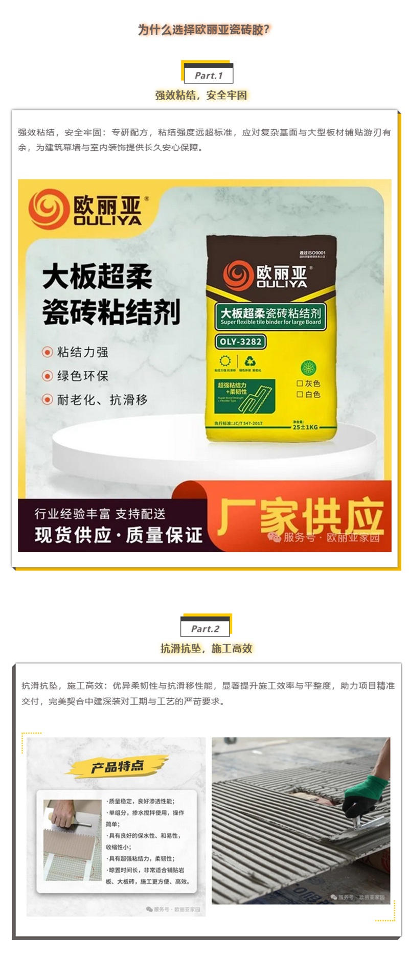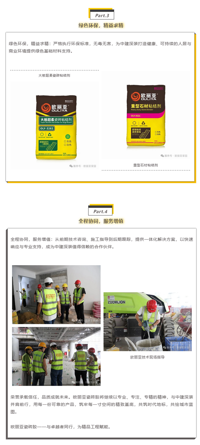 東莞市歐麗亞環保材料有限公司專注于“環保,創新”型建筑裝飾材料,瓷磚膠,硅藻泥,石材防水背膠,抗裂砂漿,裝飾砂漿,防水系列,自流平水泥,防霉膩子,二合一填縫劑的研發、生產、營銷、技術咨詢于一體的墻飾高新技術企業。